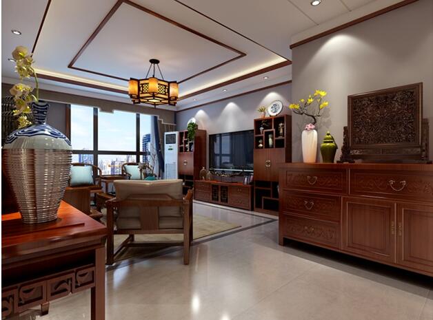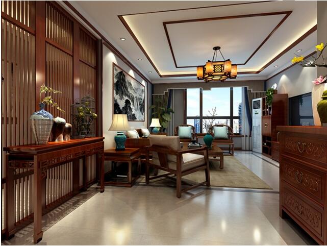 2、客廳中,頂面造型與餐廳頂面呼應(yīng),采用中式回字紋造型,并且采用純中式吊燈,與客廳中中式的紅木家具搭配,使空間干凈整潔的同時(shí)又充滿濃厚的中式韻味。