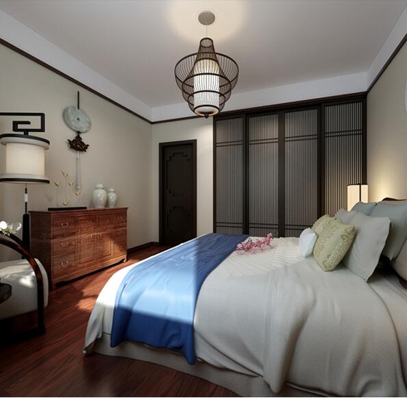 3、臥室中,頂面沒有做多修飾,只是用黑色邊線做圈線,使空間感覺干凈而整潔,而床頭的扇形飾品則充滿著濃郁的中式氣息,與實(shí)木地板和邊柜相呼應(yīng),使空間溫潤而舒適。