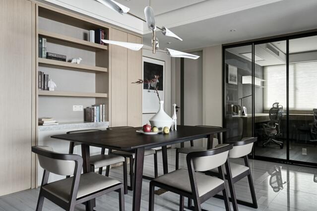 4、黑色的原木衣柜,與吊燈燈飾以及門的顏色一致,使空間統(tǒng)一,而墻面則沒有做任何修飾,只是用簡單的中式飾品作為裝飾,空間中充滿了濃厚的中式味道,簡單而又大氣。